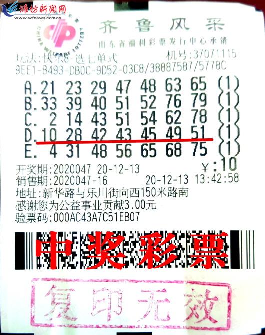 福彩最新的基诺型游戏“快乐8”返奖率高达58%,是目前返奖率最高的全国联销电脑彩票。“快乐8”共有“选一”到“选十”10种玩法,具有冗余、容错的特点。其中,“选十中十”为浮动奖级,最高500万;其余38个奖级皆为固定设奖,“选九中九”奖金30万元。这款全新的福彩游戏因其突出的特点,在上市前就受到很多彩友的关注,上市后更是销售得一片红火。 2020年12月13日,位于奎文区新华路与乐川街西150米路南的37071115福彩站传来喜讯:该站的一位彩友花10元机选了5注快乐8“选七”玩法,喜获10004元奖金。 据中奖彩站销售员黄德娟介绍,李先生(化姓)是位玩彩10余年的老彩友,对福彩的各种游戏都有所涉猎,平时经常中些小奖,遗憾的是一直与大奖无缘。2020年12月13日中午,他趁着空闲来到37071115号福彩站,坐在双色球走势图前研究号码,选好后让销售员出了票。由于与销售员黄德娟相熟,李先生买完彩票便与她闲聊了一会。在交谈中,李先生得知“快乐8”游戏刚刚上市,具有“天天开奖,大奖大,小奖多,返奖率高”等特点,也想体验一下。他对销售员说:“我前段时间就听说过这款新游戏,之前买双色球的时候也获得过‘快乐8’的赠票,但总体来说,还不是很了解。”随后,在销售员的建议下,他机选了5注“选七”玩法,“全错有奖的游戏规则,对我来说还挺新鲜,不如今天就先体验一把”。 当晚,“双色球”和“快乐8”游戏相继开奖。在核对过双色球彩票之后,李先生想起今天还买了5注“快乐8”,决定顺便核对一下中奖情况。当看到开奖号码的时候,他只觉得眼前密密麻麻的都是数字,于是打消了自行核对的念头,打算等第二天进站时让销售员帮忙核对。 第二天傍晚下班后,李先生带着未兑奖的“快乐8”彩票再次走进37071115号福彩站。把彩票递给销售员,他笑着说:“开奖号码有点多,自己兑奖挺费劲的,还是你来帮我兑一下吧!”黄德娟接过彩票,熟练地将其放入投注机的扫描仪。随后,她发现屏幕上闪出了几行小字,细看之下才知道该票中了10004元奖金。将彩票交还到李先生手中的同时,她笑着说:“恭喜啦!这张彩票中了1万多的奖金,需要去市中心领奖。”李先生闻言还以为销售员在跟他开玩笑,“真的假的?‘快乐8’这么容易中奖吗?……” 领到奖金,李先生心情大好,他直言,虽然玩彩多年,但“快乐8”对他而言还是一种“新事物”,抱着体验的想法却幸运地收获了惊喜,看来自己与“快乐8”是非常有缘分的,接下来会全面地了解它的规则和玩法,期待下一次与幸运相拥。 (潍坊福彩 王晓峰 陈龙)