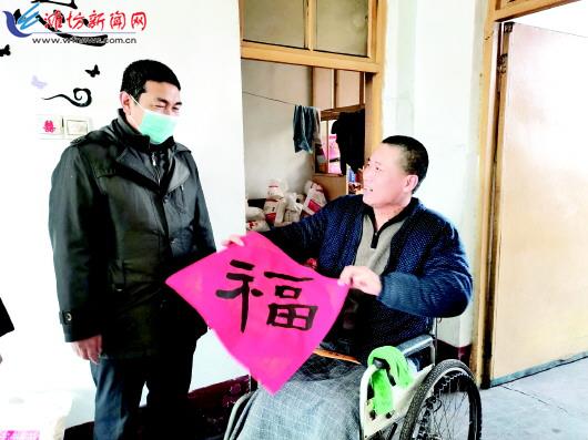 本报讯(潍报全媒体记者 隋炜凤)2月1日,潍坊日报社、正大光明眼科集团联合我市部分著名书画家,到昌乐县朱刘街道圈子社区开展“寒冬送暖·文化下乡”走访慰问活动,为23户村民送去米、面等生活物资以及春联、“福”字等。 圈子社区是潍坊日报社对接帮扶村,当日上午10时许,潍坊日报社帮扶干部和正大光明眼科集团的工作人员来到圈子社区,将大米、面粉、花生油等爱心物资以及充满翰墨香气的“福”字、春联送到贫困户张来国的手中(上图)。 据悉,“福”字和春联是我市著名书画家纪君、黄庆军、陈华、张维平、陈浩、王志勇、孙国强、段孝敏和王少川受邀专门为此次活动创作的。 在走访过程中,帮扶干部与帮扶对象深入交流,详细了解他们的基本情况,询问吃穿冷暖、收入支出、义务教育、基本医疗、住房安全、饮水安全等,并叮嘱他们要保重身体,积极面对生活。 据悉,正大光明眼科集团每年都会设立专项资金,用于扶贫、扶困等爱心事业,此次开展寒冬送温暖是企业践行社会责任的一部分。