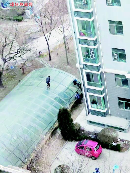 本报讯(潍报全媒体记者 刘晓梅)2月1日,高新区东方世纪城小区业主刘先生反映,眼下学生们已经放了寒假,他们小区经常有10岁左右的孩子爬到地下停车场北侧出入口的顶棚上(上图)或行人出入口的屋顶上玩耍,存在安全隐患,提醒广大家长假期一定要照看好孩子。 当天,记者在刘先生拍摄的照片中看到,有多名十岁左右的孩子正在小区内玩耍,有的爬到了停车场出入口的顶棚上,有的伸出手,在伙伴的帮助下往顶棚上爬,他们有的在顶棚上蹲着,有的在顶棚上大摇大摆地走着,还有一名男孩爬到了行人出入口的屋顶上玩耍。 记者在该小区内看到,孩子们攀爬的停车场出入口顶棚位于10号楼东侧,距离地面有三四米深,行人出入口的屋顶距离地面两三米高,孩子爬到上面玩耍,确实存在很大的安全隐患。“近几天,我经常看到有孩子爬到上面玩耍,太吓人了。”刘先生说。 该小区居民贺女士表示,她也曾多次看到有孩子爬到建筑顶部玩耍,非常危险,希望家长们能够重视此事,防患于未然。