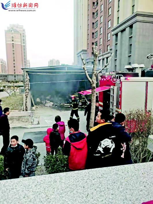 2月23日下午,在奎文区盛世香榭里小区西侧,一处建筑垃圾棚突然起火,浓烟弥漫。幸亏消防人员及时赶到,将火扑灭,没有造成人员伤亡。该小区物业工作人员表示,经调查,起火原因是孩子燃放鞭炮所致。 潍报全媒体记者 宋树云