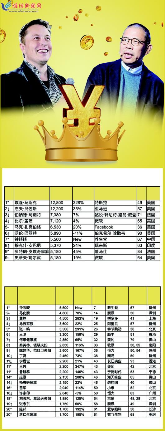 不寻常的2020年改变了不少人的生活,也搅动了全球富豪榜的风云。3月2日,胡润研究院发布《2021胡润全球富豪榜》,全球新增412位身家超十亿美元的企业家,总数达到3228人,创历史新高。特斯拉的埃隆·马斯克首次成为世界首富,中国企业家、农夫山泉的钟睒睒则成为新晋的亚洲首富和中国首富。 马斯克成最年轻的世界首富 榜单之中,最受关注的世界首富、亚洲首富和中国首富,纷纷“上新”。 49岁的埃隆·马斯克首次成为世界首富,财富比去年增加近万亿人民币,相当于每两天增加近10亿美元,达到1.28万亿元人民币。 “埃隆·马斯克是过去十年中第四位登上世界首富宝座的人,而且49岁的他是历年来最年轻的世界首富。”胡润百富董事长兼首席调研官胡润表示,比尔·盖茨四次排名第一,杰夫·贝佐斯三次排名第一,墨西哥的卡洛斯·斯利姆·埃卢两次排名第一。 马斯克的大部分财富来自他21%的特斯拉股份,特斯拉目前市值接近8000亿美元。同时,他还拥有太空探索技术公司SpaceX 52%的股份,该公司成为第一家将人类送入太空的私企后,市值增加了130亿美元,此前只有三个超级大国实现了这一壮举。 去年的首富杰夫·贝佐斯以1.22万亿元人民币的财富位居第二。他的财富增加了2000多亿元,比去年增长35%。 “奢侈品之王”LVMH集团71岁的伯纳德·阿诺特以7380亿元人民币的财富排名第三,下降了一位。在新冠肺炎疫情暴发之初,阿诺特的财富减少了250亿美元,但自那以后开始反弹,现在比去年多出7%。 65岁的比尔·盖茨以7120亿元人民币的财富排名第四,比去年增长4%。去年3月,盖茨辞去微软董事会职务,专注于他的慈善事业。 23岁就成为身家超十亿美元企业家,现年36岁的马克·扎克伯格财富首次突破1000亿美元大关,比去年增长了20%,稳居前五。 90岁的沃伦·巴菲特以5890亿元人民币的财富保持前十的位置,财富减少了1000多亿元,是榜单上财富缩水最多的企业家。 钟睒睒成亚洲首富全球前十 榜单显示,2021年中国富豪榜上前三的为钟睒睒、马化腾和黄峥,去年这三个席位则分别属于马云、马化腾、许家印。 “瓶装水之王”67岁的钟睒睒以5500亿元人民币的财富成为第一位进入全球富豪榜前十的中国企业家,排名第七,这得益于其掌控的农夫山泉去年9月在香港上市。 “很难想象,第一位进入全球前十的中国企业家不是马化腾、马云,而是67岁的钟睒睒。”胡润表示,企业总部在杭州的钟睒睒同时还取代了印度的穆克什·安巴尼,成为亚洲首富。 钟睒睒的另一家上市企业——疫苗生产商万泰生物目前市值超过100亿美元,这使他成为当今世界上为数不多的创立了不止一家价值100亿美元以上企业的企业家之一。 根据榜单,50岁的马化腾财富4800亿元位列中国第二,全球第14位,比去年上升8位;41岁的黄峥财富4500亿元位列中国第三,全球第19位,比去年上升41位;57岁的马云财富3600亿元位列中国第四,全球第25位,比去年下降4位;38岁的张一鸣财富3500亿元位列中国第五,全球第26位,比去年上升89位。 胡润研究院指出,这也是自有记录以来,首次没有房地产企业家进入中国富豪榜前十,去年位列前五的李嘉诚和许家印已双双跌出前十。 中国新增富豪数远超美国 “财富创造的速度令人震惊。”《2021胡润全球富豪榜》显示,全球新增412位身家超十亿美元的企业家,总数达到3228人,创历史新高。同时,全球身家超十亿美元的企业家总财富比去年增加二十多万亿元人民币,达到95万亿元人民币,也再次刷新纪录。 “尽管受到新冠肺炎疫情的影响,但过去一年的财富涨幅是过去十年来最大的。股票市场的繁荣和大量的新上市公司每周都造就了8位新的身家超十亿美元的企业家。”胡润预计,按照这个速度,在未来5年内,将有超50人的财富突破1000亿美元大关。 报告称,从居住地来看,2020年,中国的上榜富豪人数大大拉开与美国的差距,居住在中国的身家超十亿美元的企业家增加了259位,达到1058位,成为世界上第一个拥有1000位身家超十亿美元企业家的国家。 美国排名第二,有696位企业家上榜,比去年增加70位。由此,中国和美国的上榜富豪共占全球的54%。另,印度上榜富豪增加40位,巩固了第三名的位置,其次是德国、英国和瑞士,都有总计超过100位身家超十亿美元的企业家。 “在过去的一年里,中国新增的新面孔比世界其他国家加起来的还要多,而且远远超过了美国。”胡润表示,在过去5年里,中国上榜富豪新增了490位,而美国为160位。