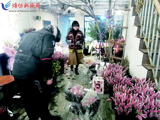 万达广场附近一家鲜花店里,店主忙着打包,快递小哥来取货。 |