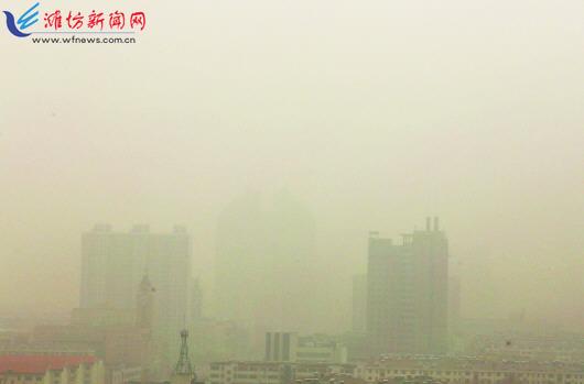 | 3月28日,城区被沙尘所笼罩的景象。潍报全媒体记者 张驰 |