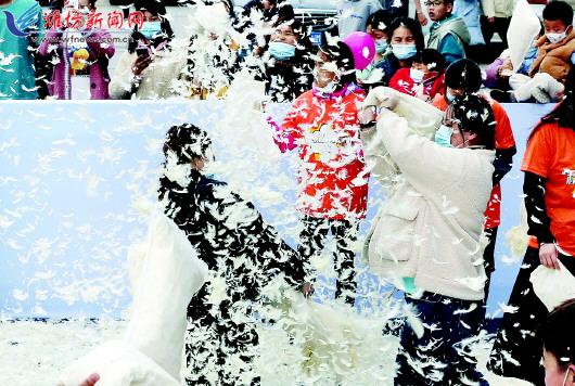 3月27日,在城区东风东街上,市民在街头参加“枕头大战”。当天,一场别开生面的“枕头大战”在城区街头举行,参加的市民使用羽毛枕头相互追打,尽情狂欢释放压力,现场欢声笑语不断。