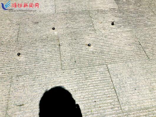 本报讯(潍报全媒体记者 王路欣)4月20日,市民刘女士反映,她经过城区胜利西街与和平路交叉口西北角,准备到白浪河岸边游玩时,险些被一处下坡裸露的地钉(上图)绊倒,希望相关单位尽快拔除,消除安全隐患。 记者来到现场看到,缓坡上有两排地钉裸露在路面上,共有十几颗,露出地面三四厘米长,过往行人小心翼翼。“下坡时大家行进速度比较快,此处裸露的地钉又比较多,存在安全隐患,希望相关部门尽快处理。”市民纷纷表示。 22日,记者辗转联系到了V1购物广场。相关负责人表示,这些地钉是拆除减速带遗留的,会尽快打磨平整,消除安全隐患,23日就能够处理完毕。 25日,市民刘女士告诉记者,相关单位已对地钉进行处理,安全隐患消除。