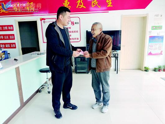 | 徐学东老人(右)把3000元现金送到潍城区岳王庙社区党委书记陈明明手中,让他们帮忙转交给涵涵妈妈。 |
