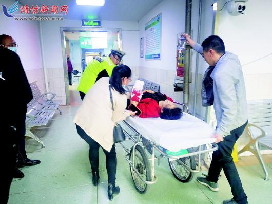 | 伤者王女士被及时送到医院后,交警帮忙送她进急救室。 |