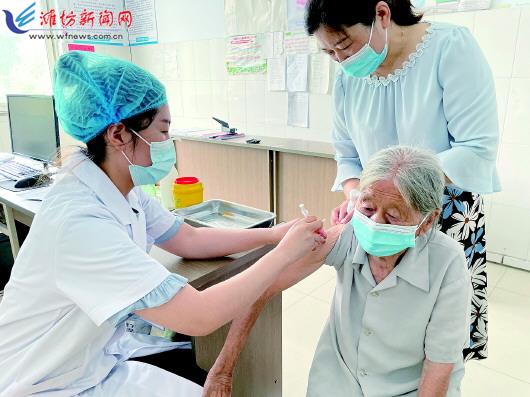 | 在昌乐县朱刘街道新冠疫苗临时接种点,医护人员为93岁的李华英接种疫苗。 |