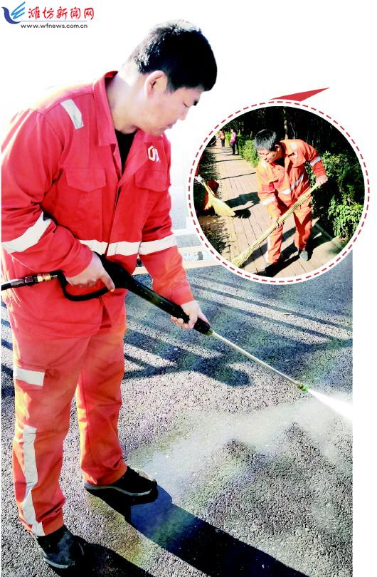 10月23日,在经济区泰祥街与鸢飞路交叉口附近,37岁的环卫工人王俊亮在用高压冲洗机冲刷路面上的泥土。2016年,时年32岁的他投身环卫事业,成为一名道路保洁员,穿梭于车流中维护路面整洁,挥舞着扫帚清走每一片落叶,开着清扫车巡查每一条街道……在平凡的工作岗位上默默坚守,无私奉献。今年,他被评选为“齐鲁最美环卫职工”,这既是对他过去工作的肯定,也成为他继续前行的动力,他和同事下定决心要把市容环境打造得更美。 □文/图 潍坊日报社全媒体记者 吕宝鑫 方文婷 发自内心热爱环卫工作,当做一种享受 “现在能够扑下身子来干环卫工作的年轻人很少,几乎找不到,王俊亮不一样,他认真、能干,踏踏实实做事。”这是潍坊和盛物业管理有限公司项目经理王峰谈起王俊亮时说的第一句话。 10月23日下午,王俊亮像往常一样,在冲刷路面卫生。他认真得有些严苛,地面上的泥沙被他用水冲刷得干干净净。“城市就跟我的家一样,我现在做的工作就跟人们在家打扫卫生是一样的,把所有不干净、不顺眼的地方都清理干净。”在谈起自己从事的环卫工作时,王俊亮眼中流露出一种热爱,他总是说:“能干这份工作是一种荣幸,我很感谢这份工作,能把负责的区域打扫干净我很幸福。” 王俊亮对于工作的感觉更多的是享受。“别人可能感觉这份工作苦累脏,但是当看到车辆行驶在干净的道路上时,我很快乐。”王俊亮说。 王俊亮几乎把所有的精力和时间都用在了工作上,城市就如同他的家,工作占据了他的大部分时间。他的直管领导王峰说:“王俊亮经常来得最早,走得最晚。单位需要加班,他从来不讲条件,只要喊一声就会跟上走。有时他下班刚回到家,身上的土还没有拍掉又接到临时任务,他二话不说马上回到岗位。”可以说,加班已经成为王俊亮的一种习惯。 五年前,32岁的王俊亮干起了环卫工作,当时他是全公司里年龄最小的一线环卫工人。他向记者坦言,最初选择这份工作就是因为兴趣,觉得城市环境要想变得更美,需要年轻一代参与进来。“环卫工作别人瞧不起,我瞧得起;别人不愿干,我愿干;别人不爱,我爱!”从业五年来,王俊亮始终坚守初心。