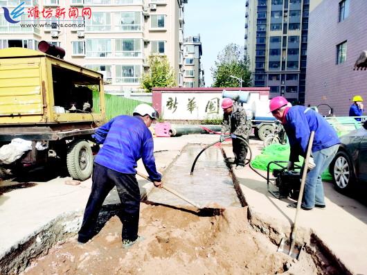 | 奎文区新华国际小区完成改造,施工人员正在回填。 |