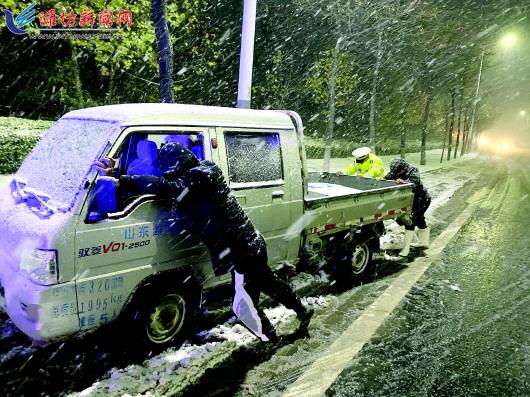 11月7日18时许,临朐县公安局交警大队四中队执勤交警巡控至上林路段时,发现有故障车辆,齐心协力将车辆推行至安全区域。当日是“立冬”节气,寒潮来袭我市,雨雪、大风、降温结伴而来。我市社会各界积极行动,清除积雪,防范事故和灾害。 潍坊日报社全媒体记者 宋树云