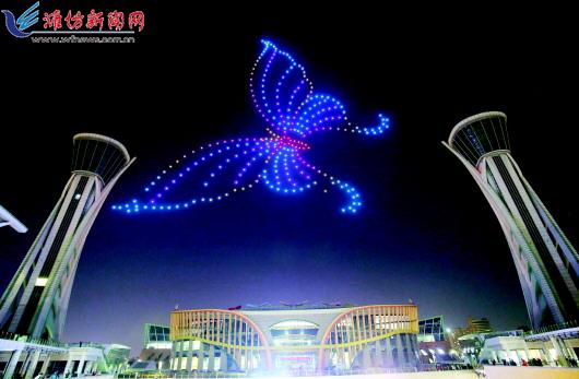本报讯(潍坊日报社全媒体记者 郭超 张驰)11月12日晚,星月交辉,霓虹闪耀,在潍坊市文化艺术中心上空,300架无人机组成的编队,变幻出一幅幅光影佳作,为潍坊市民打造了一场视觉盛宴。 当晚6时许,无人机编队蓄势待发。晚7时许,一只蝴蝶风筝造型的无人机编队率先登场,舞动的翅膀,活灵活现的姿态,生动又充满灵气,瞬间点燃了市民的热情。 随后,“云外清歌花外笛,潍州原是小苏州”的标语出现在夜空中,大家欢呼雀跃不已。紧接着,奎文门、高架桥、共享车位等造型,以星空为幕布,依次轮番登场,令人目不暇接。 无人机编队形成“潍坊模式”“寿光模式”“诸城模式”的标语,展现了潍坊三大发展模式。“人民满意的现代化品质城市”的标语,表达了我市发展的雄心壮志。“渤海之眼”摩天轮的造型巨大无比,让市民叹为观止。 本次无人机表演是由山东宫阙无人机科技有限公司执行的公益活动。15分钟的表演高潮不断,引得市民纷纷拍手称赞。家住城区紫瑞园小区的金先生表示,通过这场无人机表演,更加深刻地认识到潍坊近年来的发展步伐正不断加快,让人心潮澎湃。“城市越来越美,我们都应该为潍坊的明天贡献一份绵薄之力”。