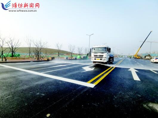 | 洒水车对卉香路进行冲刷,为通车做准备。 |