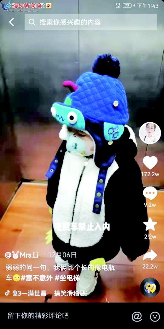 近日,一条题为“宝贝乘电梯被误认为电动车”的短视频登上多个社交平台的热搜。视频中的孩子因头戴卡通帽,被电梯车阻系统误判为电动自行车,导致电梯门无法关闭。12月15日,记者了解到,这段视频是6日发生在昌乐某小区的一幕。目前,城区不少小区安装了类似的系统,这种误判是否也会上演呢?记者进行了探访。 □潍坊日报社全媒体记者 宋树云 电梯系统闹乌龙,不少网友称也有类似经历 12月15日,记者在视频中看到,在一阵“电瓶车禁止入内”的提示音中,画面中出现一个憨态可掬的孩子,头戴蓝色帽子,身穿企鹅外套。听着不断重复的提示音,看着闪烁的灯光,孩子忍不住转身对监控探头喊:“咋那么犟?”孩子的母亲看到这一幕忍俊不禁,发布短视频时配文:“弱弱地问一句,我俩哪个长得像电瓶车?”。 该视频一经发布,引发广大网友关注,短短几天时间就获得172.2万人点赞,转发数量达22.2万次。“这个可不兴充电!”“假如抱起孩子,会不会提示‘请放下手中的电动车’?”不少网友纷纷留言调侃。也有网友称,自己曾遇到过类似情况,推着婴儿车或孩子佩戴卡通帽被误判为电动自行车。 “第一次遇到这种情况,当时也觉得比较新奇,就在抖音上发布了该视频。”视频中孩子的母亲李女士说,视频发布后没想到引发这么大的关注。她认为,除了自己儿子被误判一事有趣外,也与部分网友有类似遭遇有关,大家感同身受,引发了共鸣。