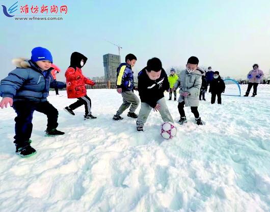 1月3日,潍坊小牛俱乐部的足球小将在潍坊海上明珠乐园的雪地里踢球。元旦假期,市民开启各种过节模式,有人上山赏冰,有人雪地撒欢,大家用各自的方式迎接新年,欢度假期。