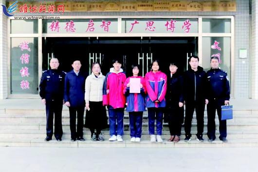 本报讯(潍坊日报社全媒体记者 张益阁 通讯员 宫德军)“善良如镜,折射内心,见证品行。感谢贵校领导、老师辛勤培养,赵苏杰、王梓榕、史润萌三位同学这种拾金不昧、乐于助人的行为值得肯定。特向三名同学提出表扬!”2月21日下午,临朐县公安局民警来到临朐县新华中学,为该校初二年级三名学生送去表扬信(左图)。原来,2月17日晚,赵苏杰、王梓榕、史润萌三人捡到一部手机,交到了“警察叔叔”手中。 2月17日下午6时许,赵苏杰、王梓榕、史润萌三人在放学途中,经过县城龙泉路与山旺路交叉路口时,发现路边有一部手机,外观很新,屏幕上还有几个未接来电。三人猜想应该是有人不小心将手机遗落在此,便来到临朐县公安局,将手机交到了值班民警沈万森的手中。 沈万森告诉记者,当时天色已晚,气温很低,三个女孩冒着寒风骑自行车到公安局,脸和手都冻得通红。因为手机有密码无法解锁,只能等失主再次来电时让其来认领。等待过程中,沈万森想让赵苏杰、王梓榕、史润萌跟着同事先去吃饭,她们连连拒绝,并表示想在这里等失主的电话。 过了一段时间,失主刘女士拨打了电话,沈万森告知她事件的过程,面对失而复得的手机,刘女士激动地连声道谢,称手机中存有很多重要资料,十分感谢拾金不昧的同学们和认真负责的民警同志。最终,在热心学生与民警的共同努力下,顺利完成了这场爱心“接力”。