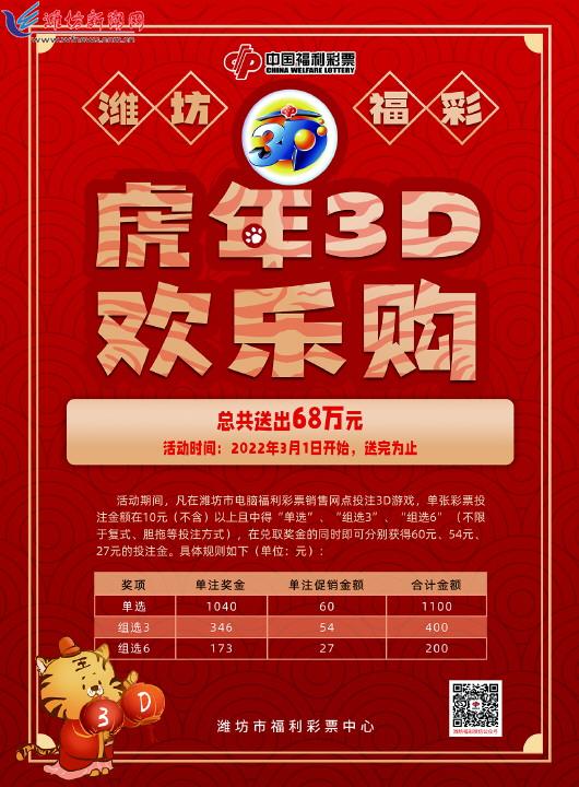 潍坊“虎年3D欢乐购”来啦!中奖还有机会赢取投注金! |