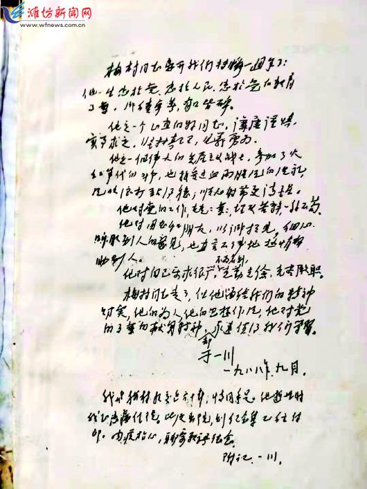 遵照耿梅村生前遗嘱,他的后事一切从简,他的亲友、同事、朋友,按捺不住悲痛,纷纷以悼文、悼诗形式,寄托哀思,歌颂他一生忠于党和人民,勤恳奉公的精神。后人们从《耿梅村同志纪念集》里,读懂了这位老人不忘初心,数十年如一日的辛劳耕耘。 遵遗嘱丧礼从简 出册子以示纪念 1987年11月10日11时30分,83岁高龄的耿梅村,走完了他的人生路。11月12日,《大众日报》为老人家的去世发了讣告。他的朋友、同事、学生纷纷从全国各地赶到济南,怀着沉痛的心情为他送行,并建议举行一个像样的丧礼,可是被耿梅村的家人谢绝了,因为耿梅村早在1984年就写好了遗嘱:他去世后不要举行任何仪式,不要给组织添一点麻烦。虽然大家都不忍心让老人家静静地、孤单单地离去,但还是尊重了他个人的意愿,用最简单的方式送他上路。他的生前好友和学生们用各自的方式,表达着自己的哀思。被誉为“山东教育界一代宗师”的著名学者庄维石先生现场提笔写下了悼词《赞梅村》。 人们看到庄老先生的悼词,自然又想起了耿梅村当年为其据理力争的场景:1958年,耿梅村担任山师中文系党总支书记,庄维石是中文系讲师,在“整风反右”运动中,院校个别领导以自己的偏见,要将庄维石定为“右派”。当时耿梅村对给庄维石所列“罪状”并不清楚,但在他眼里,庄维石老师是一位博学渊通,学术造诣极深的学者,而其教学更是循循善诱、诲人不倦;淡泊名利、默默奉献。他无法相信这么优秀的一位讲师会是什么“右派”,于是经过反复多次调查取证,用证据证明庄维石是一位拥护共产党的正派老师,多次在党委会上据理力争,为庄维石辨白。最后他的意见虽没被采纳,且不久又被调离岗位到图书馆任馆长,但他仗义执言、主持正义的作风被广大师生传颂。 庄维石老先生的题词,启发了前来吊唁的亲友、同事、学生。大家纷纷表示,尊重老人家生前愿望,丧事从简,不搞大型纪念活动,但可以用文字的方式,各自表达哀思。众人最后一致建议出一本纪念集,为耿梅村的平生作一个传略,也发表一些悼文。 诗文赞歌悼念 精神感召后人 《耿梅村同志纪念集》于1988年冬完成印刷与亲友学生见面。当时山东大学的蒋维崧教授在病中为本书题写了书名,该纪念集共收录悼文、悼诗近60篇,与耿梅村共事过的生前好友,除庄维石又献《梅村兄千古》的悼诗外,还有曾任外交部副部长的宫达非,曾任中共中央纪律检查委员会秘书长、中央监委监察处处长等职的于一川分别撰写悼文。 宫达非在《他是一个真正的共产党员》一文中有这样几句:“在同耿梅村同志共事的年月里,从没有听到他对工作中的困难叫一声苦,也没向领导要求过什么……他总是很乐观、很有信心而又沉着地想方设法完成新接受的任务。在战争年代里,不顾生死去完成党交给的任务,在胜利之后,于平凡岗位上忠诚坦荡地工作,将任何权势、任何名利都置之度外,数十年如一日,称得上一个高尚的人,一个有道德的人,称得起一个真正的共产党员,一个优秀的共产党员。” 于一川是耿梅村1928年在家乡与于画舫一同发展的党员,他在《怀念梅村》一文中写道:“我与梅村相交近60年,情同手足。他一生忠于党、忠于人民、谦虚谨慎、实事求是、坚持真理、见义勇为,对同志和朋友以诚相见,热情帮助别人;对自己要求很严,不为名利,克勤克俭。” 他的同事、乡亲、学生和受他教育过的晚辈也各用文字表达怀念。小庄子村党支部、村委会在悼文中写道:“梅村同志与世长辞了,他不为名、不为利,忠于党的事业,为我们家乡子孙后代树立了光辉榜样,他给我们留下的精神财富将永远激励着我们前进!” 自《耿梅村同志纪念集》发行至今30多个冬来春往,后人一代又一代、一年又一年从书中读懂了老人不忘初心,数十年如一日的辛劳耕耘,字里行间永远展现着老人家坚实的脚印和永不消失的身影。 耿梅村的母校牟家院小学早已今非昔比。开阔洁净的校园,宽敞明亮的教室,先进完备的教学设施,鸟语花香伴着琅琅读书声。一进大门,展现在眼前的是潍北共产党组织创始人牟鸿礼生平简介;走进教学楼,介绍中共潍北第一个三人支部艰苦建党的多幅版面映入眼帘;走进图书室,整洁的一排排书架正面,设立了“耿梅村专区”,当年耿老捐赠的图书整齐摆放着。美好生活在先辈的拼搏奋斗中一步步变成了现实。 本期图片由牟林冰、牟兰贞提供(署名除外)