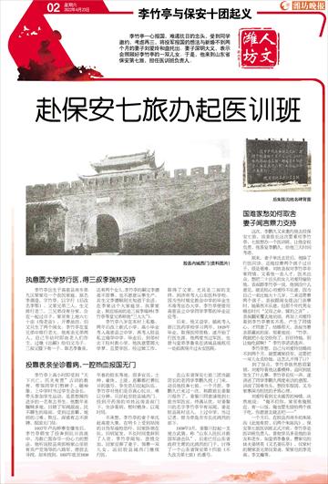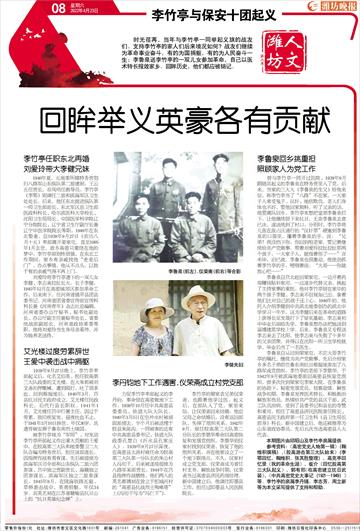 时光荏苒,当年与李竹亭一同举起义旗的战友们、支持李竹亭的家人们后来境况如何?战友们继续为革命事业奋斗,有的为国捐躯,有的为人民奋斗一生;李鲁泉送李竹亭的一双儿女参加革命,自己以医术特长报效家乡。回眸历史,他们都应被铭记。 李竹亭任职东北再婚 刘爱玲带大李健兄妹 1940年夏,五地委所辖特务营划归八路军山东纵队第二旅建制,王云五任营长,谷凤鸣任教导员,李竹亭(李鄂)则调任二旅和滨海军区卫生处处长。后来,他任东北挺进纵队第一师卫生部部长、东北军区总卫生部医政科科长、哈尔滨医科大学校长、沈阳卫生局局长、中国医学科学院辽宁分院院长、辽宁省卫生厅副厅长兼辽宁中医学院院长等职。1949年在东北娶妻。自1939年9月27日(农历八月十五)率部离开姜家屯,直至1995年1月去世,故乡高密只萦绕在他的梦中。李竹亭原则性很强,在东北工作期间,家乡有亲戚找他“走走后门”,办点事情,他从不点头,以致于有的亲戚气得不再上门。 刘爱玲将李竹亭遗下的一双儿女李健、李志美拉扯长大。长子李健,1945年12月在高密城郊区参加革命工作,后来南下,任河南省镇平县团县委书记,河南省团省委宣传部宣传科科长兼《河南青年》杂志社总编辑,河南省委办公厅秘书、秘书处副处长、办公厅副主任兼秘书处长、省委统战部副部长,河南省政协常委等职。他将刘爱玲当生身母亲看待,并为她养老送终。 艾光楼过度劳累辞世 王爱中袭击战中捐躯 1939年9月27日晚上,李竹亭率部起义后,化名艾伯英、担任胶高第三大队政委的艾光楼,在大朱郭被刘文斋扣押缴械,遭到殴打,吐了很多血。回到根据地后,1940年3月,莒县抗日民主政府成立,艾光楼任民政科长,后代行县长职权。1941年1月,艾光楼任莒中行署主任。因过于劳累,致旧疾复发,昼夜吐血不止,于1941年3月10日辞世。年仅30岁。其遗骨被安葬于鲁东南烈士陵园。 被李竹亭视为“军师”、对发动李竹亭所部起义作出重大贡献的王爱中,在胶高第三大队和地委警卫二大队合编为特务营后,担任该部连长。因指挥作战有勇有谋,先后被提拔为滨海军区司令部和山东纵队二旅六团参谋、莒中独立营副营长、海赣独立团参谋长、滨海军区独立二旅参谋长。1945年9月,在陇海铁路瓦窑、草桥袭击战中,英勇捐躯。年仅34岁。其英名刻在江苏省赣榆县抗日山上的“抗日英雄纪念碑”上。 李丹钧地下工作遇害,仪荣斋成立村党支部 力促李竹亭率部起义的李丹钧,奉命留在高密做地下工作。1939年10月任中共高密县委委员、铁道大队大队长,1940年3月5日在空冲水村被顽固派捕去,半个月后被活埋于胶县朱陈沟。一同被害的还有中共高密县委书记、铁道大队政委孔楚白(沂水县孔家庄人)。1939年9月27日深夜,在高密县太洛村被任命为胶高第三大队第一分队长的朱公村人冯仞千,后来被逐级提拔为八路军某部营长,1944年在莒县指挥作战牺牲。他们两人的英名都镌刻在耸立于拒城河村的“高密县抗战烈士殉难塔”上(冯仞千写为“冯仁千”)。 李竹亭的舅家表兄弟仪荣斋,也跟着他学过医。起义后,在部队入了党,家里来信,让仪荣斋回来结婚。他应父母之命结婚后,没有返回部队,失掉了组织关系。1942年9月,原任胶高第三大队第二分队长的李景华奉命回高密恢复和发展党组织,李景华到仪家村找到仪荣斋,恢复了他的组织关系,并在他家设立了一个地下联络点。不久,仪家村成立党支部,仪荣斋成为首任村支书。解放战争时期,仪荣斋当过高密县济民药房经理。新中国建立后,他调往即墨县工作,担任过即墨县人民医院院长。 李鲁泉回乡挑重担 照顾家人为党工作 曾与李竹亭一同开过医院、1939年9月跟随其起义的李鲁泉在特务营里入了党。后来,当家的三大大(李鲁泉的生父)给他来信,称李竹亭当了“八路”不在家,一大家子人常受鬼子、汉奸、地痞欺负,老人们身体也不好,要他回家照料。听了父亲的话,他要离队回乡。李竹亭本想把堂弟李鲁泉拦下,让他继续留下来抗日,无奈李鲁泉去意已决,遂送他到了村口。分别时,李竹亭将几张在敌占区通行的“汉奸票”硬塞到李鲁泉的口袋里,攥着李鲁泉的手,说:“兄弟!我没挡下你。你回到咱老家,要记着继续给共产党做事,帮着刘爱玲拉扯拉扯那两个孩子。一大家子人,就指着你了……”言未毕,泪已流。李鲁泉也很激动,他使劲抓着李竹亭的手,哽咽着说:“大哥……你就放心吧……” 李鲁泉自莒北赶回梁家屯,一边开着药房赚钱贴补家用,一边逐步代替父亲,挑起了主持家事的重担。他对李竹亭留在家中的两个孩子李健、李志美不但视如己出,拿着他们比对自己的孩子还上心。1946年初,他托人介绍李健到中共滨北地委创办的滨北中学学习一年半,这为李健后来在革命的道路上获得长足发展打下了坚实基础。李志美初中毕业后面临失学,李鲁泉想办法把她送到淄博建筑学校上学。后来,李鲁泉又专程送李志美去了沈阳,使李志美与失散了十多年的父亲团聚,并得以在沈阳一所卫生学校就学,毕业后当了一名医生。 李鲁泉自从回到梁家屯,不忘大哥李竹亭的嘱托,继续为共产党做事,先后介绍家乡多名子弟前往鲁东南抗日根据地参加了八路军或党组织。李竹亭的老部下李景华,于1942年9月被滨海地委派回高密县恢复党组织,曾多次住到梁家屯李家大院,在李鲁泉的协助下,秘密发展党员,侦察敌情。解放战