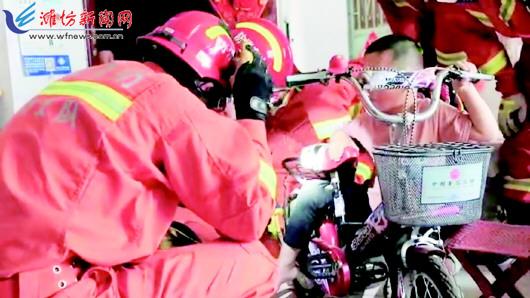 本报讯(潍坊日报社全媒体记者 张益阁)4月24日下午,诸城市密州街道一小区内一名男孩被自行车卡住右腿动弹不得,急需救援。 在接到男孩家人的求助电话后,诸城市消防救援大队指挥中心立刻调派救援力量赶赴现场。下午3时许,消防救援人员抵达现场发现,男孩的右腿被卡在自行车座与后座之间的缝隙内,他左腿支撑在地,无法动弹,情绪很不稳定,显得十分害怕。“叔叔快救救我,我骨折了。”看到救援人员后,男孩哭着求助道。 “没事没事,别害怕。”救援人员一边观察自行车的构造,一边安抚男孩的情绪。根据现场情况,救援人员决定利用钳子、扳手等工具,拆卸自行车后座救援(上图)。在此过程中,救援人员小心谨慎,以免对男孩造成二次伤害。整个拆卸过程十分顺利,仅用1分多钟,男孩被卡住的右腿便顺利脱困。 经检查,男孩的右腿无明显外伤,男孩自述也没有感到不适。在确认该男孩身体并无大碍后,家长再三向救援人员道谢。