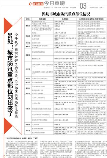 □潍坊日报社全媒体记者 赵春晖 实习生 于姝雯 6月14日,记者从潍坊市城市管理局获悉,我市排查出了26处城市防汛重点部位,目前已经全部落实应急防范措施,同时向社会公布。广大市民要时刻关注天气预警信息,提前做好防范应对和避险准备。 伴随着汛期到来,我市降雨天气会逐渐增多。今年我市城市防汛工作部署早、行动快、覆盖广,提前做好城市防汛工作准备,修订评估了城市防汛应急预案,召开防汛工作会议,对全市城市防汛工作做了安排部署,力求最大程度保障广大市民生命财产安全。 提前开展城市防汛隐患检查。累计检查353个基层体系(37个街道、81个社区、235家企业)、检查2130个点位,整改152处隐患。同时,做好排水防涝设施管护。整治170公里行泄通道,清疏1187公里的雨水管渠,清掏8.14万个雨水口,加装防坠网1.38万个。 提升防汛应急抢险能力。组建1.42万人的城市防汛队伍,开展93场次城市防汛应急演练,配足配齐排涝泵、砂石料、编织袋等各类防汛物资,确保关键时刻调得出、运得快、用得上。 开展城市防汛重点部位摸排。对城市防汛重点部位、低洼易涝点、下穿桥涵、危旧房屋、在建工地、地下设施等进行全面摸排,并拉出责任清单。还开展了城市防洪排涝排查整治,开展防洪排涝隐患排查、排水防涝设施清疏、有限空间作业管理、窨井盖整治、雨水井箅治理、路灯防漏电等多个专项行动,对城市防汛隐患进行摸排整治。 全力提高信息化防汛水平。在中心城区15座下穿桥涵设置积水警示和安全通行保障系统,在7处下穿式通道和17处下沉式桥涵安装视频监控,与1100余个交警监控和30余处水文监测实现了资源共享,有力提高了汛情应急处置能力。 潍坊市城市防汛重点部位情况 区域 隐患位置 隐患描述 已采取措施(工程整治/防御性措施) 奎文区 胜利东街文化路口南 市政道路低洼处 配备水泵□防汛沙袋,必要时组织强排 苇湾社区4号楼□46号楼 地势低洼,落差大 配备水泵□防汛沙袋,必要时组织强排 李家街社区北下河拆迁区域 地势低洼 配备水泵□防汛沙袋,必要时组织强排 奎文门社区泰华城白浪河假日广场□泰华新天地公寓大楼和奎文门 地势低洼 成立抢险队伍,购买防汛物资,安装防洪闸门 潍城区 杜家庄 房屋老旧□地势低洼 修缮房屋,加强汛期值守包靠,汛情严重时由南关街道组织人员疏散 春鸢路铁路桥 遇强降雨持续时积水 设置警示标志,疏散人员,水泵排水 白浪河西岸 遇强降雨持续时,对沿河建筑有倒灌危险 加强巡查值守,水泵排水;设置警示标志;疏散沿河人员 坊子区 建材路东辛村 地势低洼,排水不畅 汛期安排专人职守,准备抽排机械,及时排水,保障汛期安全 寒亭区 通亭街(渤海路-金马北路)排水工程 地势低洼,遇强降雨持续时积水,排水不畅 新设d1000雨水管道约950米及路面恢复 高新区 潍安路胶济铁路桥底 潍安路排水管道未与凤凰街相连接 实施□潍安路铁路桥排水连接工程□,包括新建3*3米雨水箱涵,南侧与凤凰街雨水管道连接,北侧与新建雨水箱涵连接,全长约125米;更换桥下两侧雨水箅子 樱前街高二路 樱前街高二路处河道排水流量小 实施樱前街(潍安路-杨瓦路)排水改造工程,贯通樱前街高二路浞河河道,全段现状排水管道清淤;更换□维护破损的检查井□雨水箅子 经济区 G308国道(禹王北街)与长松路交叉口 G308国道(禹王北街)污水管道遇降雨超负荷运行,大量雨污混合水溢流至长松路路面,造成短时大量积水无法排出形成汛期积水隐患 已落实人员包靠,降雨时迅速落实解决措施 G308国道(禹王北街)与友爱路交叉口 G308国道(禹王北街)污水管道遇降雨超负荷运行,大量雨污混合水溢流至友爱路路面,造成短时大量积水无法排出形成汛期积水隐患 已落实人员包靠,降雨时迅速落实解决措施 滨海区 北海路与长江西街交叉口 蓝色畅想转盘处路面低洼,已形成小水坑 降雨时重点巡查□包靠,对排水管清淤疏通,配备排水泵强排 峡山区 郑玄路峡清街路口 管道末端管径较小,导致排水不畅出现积水 降雨时重点巡查□包靠,准备2台排水泵强排,下一步尽快配套完善路网及雨水管网 青州市 玲珑山路铁路立交桥 铁路桥底地势低洼,汇水面积大,遇短时强降雨出现积水 加强降雨期间的巡视,及时开启泵站,协调交警部门封闭交通 海岱路铁路立交桥 铁路桥底地势低洼,汇水面积大,遇短时强降雨出现积水 加强降雨期间的巡视,及时开启泵站,协调交警部门封闭交通 寿光市 菜都路五里墩转盘 强降雨天气易形成积水,影响交通 降雨期间加强巡视,及时开启泵站或限行 安丘市 人民路人民医院北门 地势低洼,遇强降雨时下水道排水缓慢 汛期前对积水点附近井箅进行清淤;大雨时,包靠小组打开井盖□清捞树叶□垃圾等杂物,并插上小红旗,守在现场,直到积水排尽 人民路庄头村 地势低洼,已建有泵站,但泵站入水口易被垃圾堵塞 汛期前对积水点附近井箅进行清淤;大雨时,包靠小组清捞树叶□垃圾等杂物,守在现场,直到积水排尽 莲花山路(新安路-香江路)路段 地势低洼,排水管道排水速度缓慢 派专人盯靠,汛期前对井箅进行清淤;大雨时,包靠小组打开井盖□清捞树叶□垃圾等杂物,并插上小红旗,守在现场,直到积水排尽 永安路(商场路-向阳路)路段 排水管道排水速度缓慢 汛期前对积水点附近井箅进行清淤;大雨时,包靠小组打开井盖□清捞树叶□垃圾等杂物,