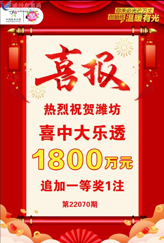 6元擒获1800万元! 潍坊购彩者喜中体彩大乐透一等奖 |