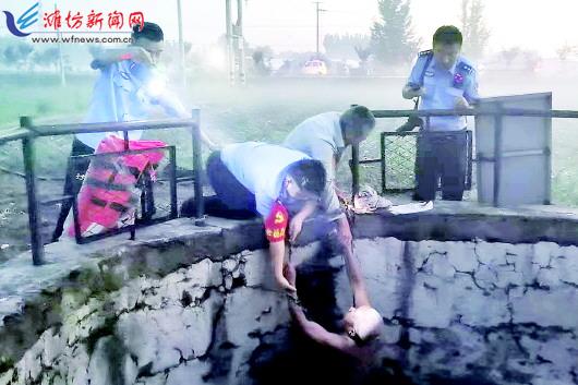 本报讯(潍坊日报社全媒体记者 张益阁)7月8日凌晨4时许,安丘市公安局金冢子派出所民警接到报警,称辖区尧沟村村东一口井内有人呼救。 接警后,4名民警带上救援绳索、救生衣等装备,迅速赶赴现场。民警在现场看到,井口直径约3.5米,水深七八米,一位白发老人身体泡在井水里,冻得瑟瑟发抖,双手紧紧抱住从井台垂入井中的抽水管,正不停地呼救。虽然水面距离井口不到2米,但老人已经精疲力竭,无力自救。 见状,一名民警跪在井台上,探出双手抓住了老人的手臂,同时用携带的绳索将老人牢牢套住,之后用力将老人向上拉拽(右图)。另一名民警立马绕到探身入井的民警身后,把住其腰带防止发生意外,并提供照明。 最终,在民警与报警群众的密切配合下,落井老人被成功救出。经询问,被救老人是附近村民,今年已经74岁。当天凌晨,他下地干活时不慎滑落井中,所幸求救声被报警人发现,否则后果不堪设想。对于民警与报警人的及时救助,老人一再道谢。