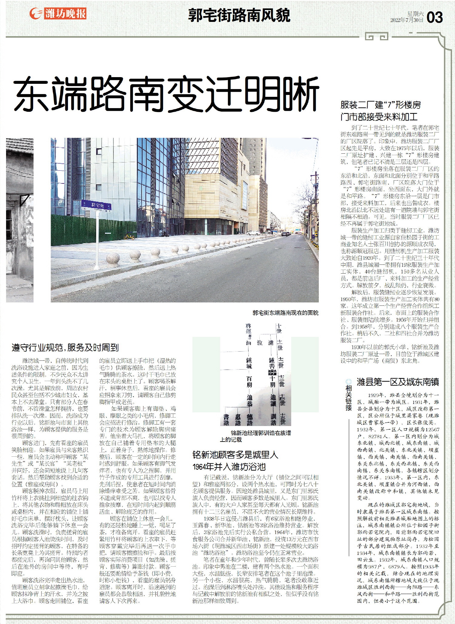拥有数百年可追溯历史的郭宅街,为潍坊城一条地理状况较为整齐规范的古街。郭宅街东端路南的相关地域,一百多年间的地理变迁轨迹还算清晰明了,折射着城市在这段区间内教育以及相关工商业的发育、存续状况和城市的军事价值。 郭宅街不短也不窄 地理状况整齐规范 二十世纪30年代的记载以及地图标注中的郭宅街,东西走向,长约410米左右,宽约5米,当时隶属于潍县第一区城东南镇,在潍县城厢一带的古街中,不算短,也不算窄,地理状况较为整齐规范。 郭宅街的东口为一处丁字路口,与东马道相交。东马道由此向南370米左右到达潍县城内东南角,与南马道相交。东马道由此向北500米左右到达潍县城内东北角,与北马道相交。 自东口沿郭宅街西行160多米,路北出现一处丁字路口,与棋盘街相交。棋盘街由此向北130米左右与东门大街(现潍城区东风西街一带)相交,与文庙大门隔东门大街相望。棋盘街正对文庙大门,为文庙建筑群中轴线的延伸线。 由棋盘街南口再西行30米左右,郭宅街路南又出现一处丁字路口,与南巷子(原址一带为潍城区松园子小区东沿外的一条无名通道)相交。南巷子由此向南110米左右与南宫后街、松园子街(原址一带为现潍城区松园子小区内的一条无名通道)相交,与射步亭街(原址一带为该区松园子小区东沿外的一条无名通道)相通。 从南巷子北口沿郭宅街继续西行220米左右,到达郭宅街西口,为一处不算规则的十字路口。由该处十字路口向西接小十字口东街,本地俗称“郎家野圈”,通西面130米处的布政司街(现潍城区布政司街一带)、交田宅街(该区向阳路一带);向南与预备仓街(原址一带为该区松园子小区西部的一条无名通道)相交,通南面330米处的南寺山门前小空场;向北与兴隆街(该区预备仓街一带)相交,通北面130米处的东门大街——大十字口东街(该区东风西街一带)。 因郭姓居多而得名 历史可追溯至明代 关于郭宅街地名的由来,当代官方的解释很简洁:“郭姓居多,因名。” 当代官方解释中所说的郭姓,多为历史上潍县城里东门里郭氏的族人。明代成化九年(1473),高唐人郭礼因那一带灾害与战乱并生,带着儿子郭翠搬迁到潍县,定居东门里(官方公布的地名为东门大街,大致是现在潍城区东风西街的和平路至预备仓街段)。因而,该支郭姓族人自称潍县东门里郭氏。 郭礼,有廪生功名,迁移到潍县以前就做过塾师,定居潍县东门里以后仍以此为业。此后数百年间,郭氏重视通过科举考试获取功名踏入仕途、勤于通过著书立说传播传承传统文化。清亡后,该支郭氏中从事教师职业以及擅长书画的族人众多,其中不少人为地方知名人士,其相关事迹有记载。 该支郭氏族人在历史上的潍县城里一带聚居广泛,以郭宅街最为集中。郭宅街地域内知名民居星罗棋布,其中不少知名民居的主人为该支郭氏族人。故“郭姓居多,因名”的郭宅街,其历史至少可以追溯至明代。 郭宅街地域内曾分布着多处知名民居、建筑、工商实体、新闻机构、宗教文化团体、政府职能部门等,数不胜数的地方知名历史人物曾在这里定居,因而,这条古街展现的地方文化风貌丰富多彩。 自这条古街东端的路南开始,分别予以梳理展现。 郭氏小学校舍毁于军阀混战炮火 早先,郭氏小学在郭宅街东端路南办学14年。有记载说,1916年,郭氏两等学堂自西门里大街(官方公布的地名为西门大街,现东风西街一带)迁至郭宅街东端路南,改称郭氏小学,办学规模为五个教学班,在校学生共有200人左右,校长陆文会。 1930年,军阀中原大战中,阎锡山、冯玉祥军炮击潍县城,郭氏私立小学校舍毁于炮火,学校不得不搬迁到附近的郭宅街路北郭氏家庙内。 1930年夏,阎、冯军围困潍县城,占领潍县火车站(现在的胶济铁路潍坊站)以及县城附近的一些村庄,在县城西南方的黄土埠、马良冢子(现在都属于潍城区南关街道辖区),天主教堂外树林内(位于现潍城区胜利西街和平路口以南、和平路路东一带)等处设置大炮,向城内及联系城里、东关必经的白浪河河道(现亚星桥一带)进行炮击。 半个月后,阎、冯军西退,潍县城解围。有统计说,县城遭困半月间,民众丧命于炮弹之下的,城里有12人,各关厢23人;受伤致残者,城里35人,各关厢55人,共计伤亡125人。潍县城厢一带遭到炮火炸毁的房屋共124间,屋山18堵,墙6堵,包括城里郭宅街东端路南郭氏小学的校舍。 东段路南首户解放前曾是浴池铭新池 郭宅街东端路南第一户,在解放前的一段时期,为一家浴池的所在地。浴池的字号为铭新池。历史上潍县城厢一带的民众也称浴池为澡堂。 有记载说,铭新池是以一处四合院结构的房产为依托建造的。起初,铭新池经理是巩文秀。相传开办铭新池的资金是巩文秀的父亲巩绍庵向朋友集的股,每股50元(银元),共募集了10股,即500元。因巩绍庵交游广、朋友多,这些资金都为大家友情帮助、无偿赠送。铭新池后来出让给本地人郭训祥。郭训祥系东门里郭氏族人。 也有记载说,铭新池是当时家住附近松园子街东端路北的绅界人员、东门里郭氏族人郭雨若的产业。郭训诰任经理,也是东门里郭氏族人。郭训诰的儿子郭天熙解放后曾在本地一家国营饭店做厨师。 历史上的潍县城厢一带,1918年到1934年,在市面上先后有新德楼、三新池、玉露春、复兴池、新华池、铭新池等9家浴池开业。洗浴成为营商行业之一。其中,由商人韩铭晋投资、1932年